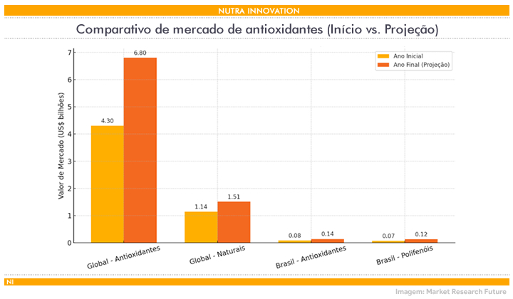 Além disso, o mercado brasileiro de polifenóis, uma classe importante de antioxidantes, foi avaliado pela Market Research Future em US$ 69,6 milhões em 2024, com projeções de atingir US$ 125 milhões até 2035, refletindo um CAGR de 5,47% durante o período.