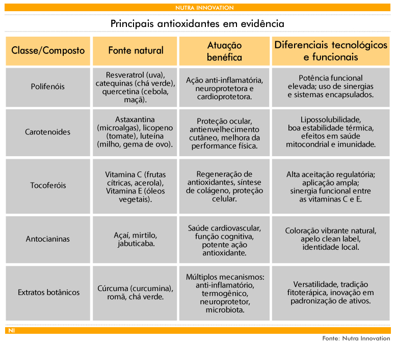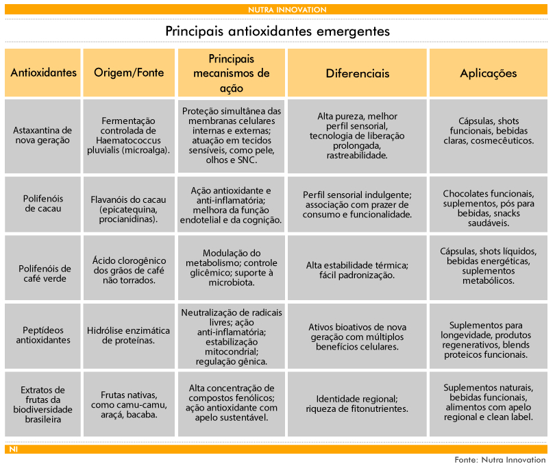 Entre os ingredientes emergentes que começam a ganhar espaço nas formulações e nos estudos clínicos, estão a astaxantina de nova geração, polifenóis de cacau e café verde, peptídeos antioxidantes e extratos de frutas da biodiversidade brasileira, com alta concentração de compostos fenólicos e apelo de sustentabilidade.