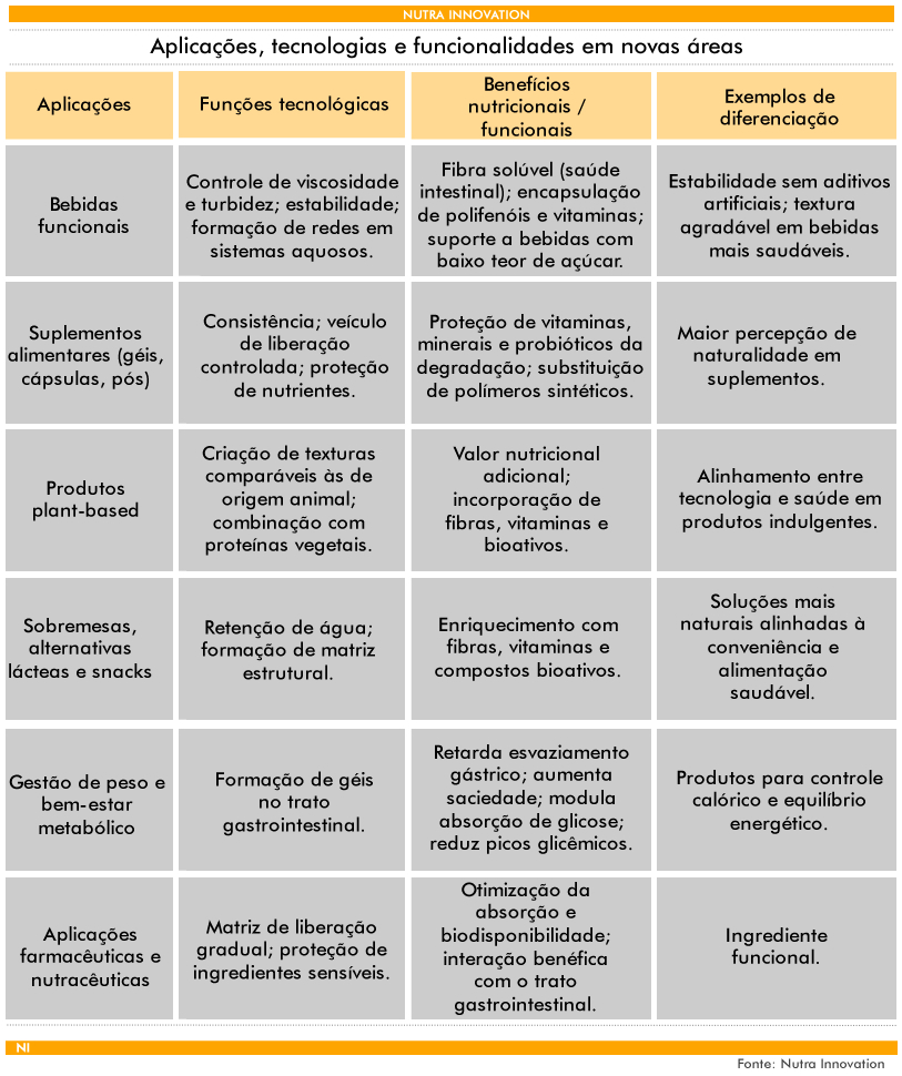 Essa transição do uso quase exclusivo por suas qualidades texturizantes para aplicações com foco nutricional, se conecta a tendências globais em diversas categorias voltadas à nutrição e à saudabilidade, envolvendo desde fibras alimentares e produtos plant-based, até suplementos mastigáveis e soluções clean label.