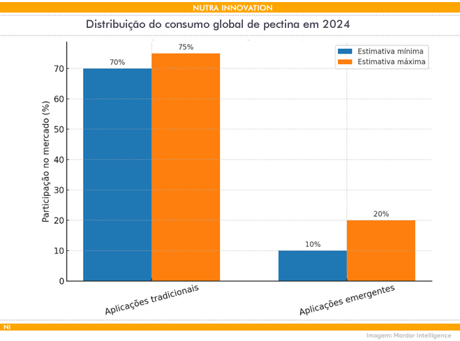 As aplicações tradicionais, como geleias, compotas, confeitaria e panificação, ainda respondem pela maior parte do consumo de pectina no mundo. Estimativas apontam que cerca de 70% a 75% da demanda global em 2024 esteve ligada a esse tipo de uso, no qual a pectina atuou como agente de gelificação, espessante e estabilizante. Entretanto, cresce rapidamente o espaço destinado a aplicações consideradas emergentes, que englobam bebidas funcionais, iogurtes com alegações de fibra ou naturalidade, produtos plant-based, suplementos nutricionais, além de formulações farmacêuticas e cosméticas. Embora ainda representando uma fatia menor do mercado total, em torno de 10% a 20% em 2024, esses segmentos são os que apresentam maior ritmo de expansão, favorecidos por tendências como rotulagem limpa, substituição em gomas e cápsulas, e uso de fibras solúveis na promoção da saúde intestinal (Mordor Intelligence).