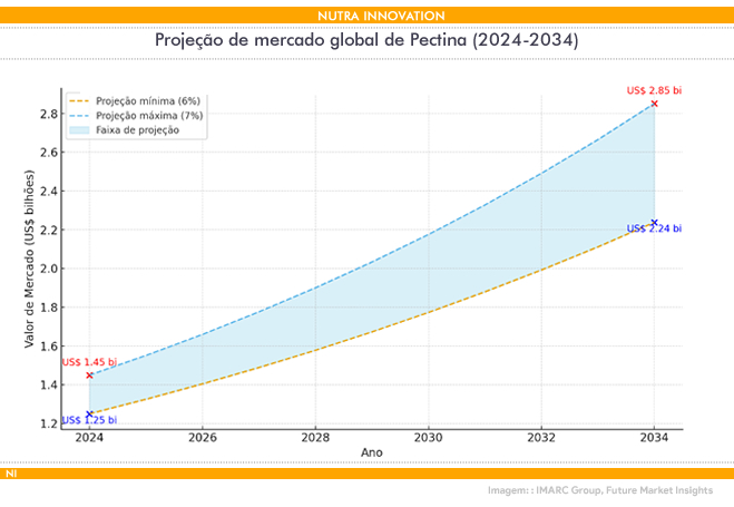 Sua relevância também é observada nos dados de mercado. Em 2024, o mercado global de pectina foi estimado entre US$ 1,25 bilhão e US$ 1,45 bilhão, com projeções apontando para uma expansão anual de aproximadamente 6% a 7% nos próximos anos, o que significa que até 2033-2034, poderá atingir entre US$ 1,9 bilhão e US$ 2,1 bilhões, segundo dados da IMARC Group e Future Market Insights, respectivamente.