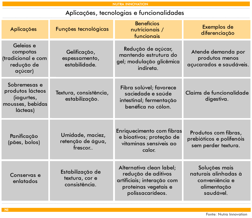 Historicamente, a pectina se consolidou na indústria como agente de gelificação, espessante e estabilizante, encontrando seu lugar em geleias, compotas, doces, sobremesas e produtos de panificação. Nessas aplicações, sua função é essencialmente tecnológica: garantir textura, consistência e estabilidade durante o armazenamento. Hoje, essa mesma função técnica se alia à demanda crescente por produtos com perfil nutricional aprimorado, mostrando que a tradição pode ser reinterpretada sob uma ótica funcional.