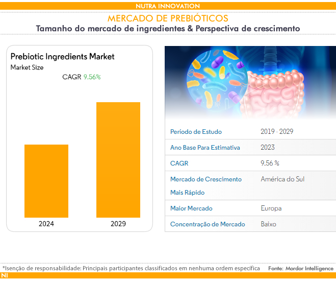 De acordo com relatório da Mordor Intelligence, o mercado de ingredientes prebióticos cresceu de forma significativa com a pandemia. Em 2020, o setor foi avaliado em mais de US$ 5 Milhões e a expectativa é que atinja um CAGR de 9,56% durante o período de previsão (2024-2029). Nesses últimos anos, a mudança no comportamento do consumidor em busca de manter uma rotina de alimentação saudável e balanceada impulsionou esse mercado, que é segmentado por tipo: inulina, frutooligossacarídeo, galactoligossacarídeo entre outros. A aplicação é dividida em alimentos e bebidas funcionais, fórmula infantil e comida para bebês, suplementos dietéticos, ração animal e alimentos para pets. Ainda segundo o relatório, hoje o maior mercado é o europeu e o mercado de crescimento mais rápido é a América do Sul.