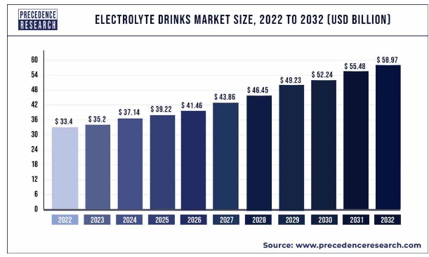 A Precedence Research estimou o mercado global de bebidas eletrolíticas em mais de US$ 33,4 bilhões e espera que o mercado alcance quase US$ 59 bilhões até 2032, com uma taxa de crescimento anual composta (CAGR) de 5,9% de 2023 a 2032.