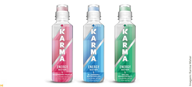 Disponível nos sabores Raspberry Peach, Blueberry Watermelon e Melon Dragonfruit, a Karma Energy Water apresenta a tampa patenteada PushCap da empresa, que armazena os ingredientes ativos em uma câmara hermética até serem liberados pelo consumidor.